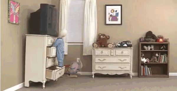 父母没有把抽屉柜正确固定在墙上,孩子在玩耍时很容易被抽屉柜砸倒。家长一定要仔细检查家里的各种家具,把容易发生倾倒的都固定在墙上。