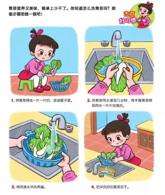 例如,孩子在厨房帮忙时,可以让他们从洗青菜开始做起,跟着古豆一起试试吧↓↓↓
