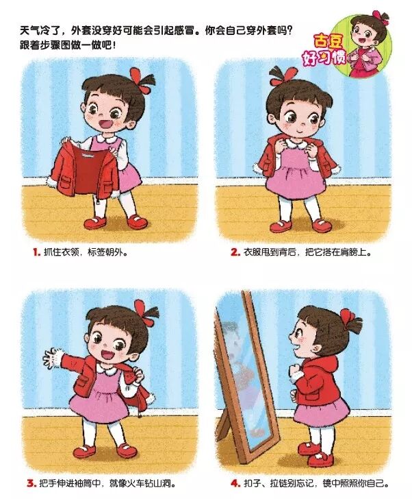 冬天虽然冷,但也要坚持让孩子自己穿衣哦!怎样又好又快地穿上外套呢?跟着古豆一起做吧↓↓↓