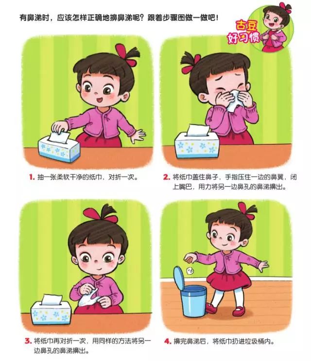 例如,天气冷了,当孩子擤鼻涕时,可以教他们这样做↓↓↓