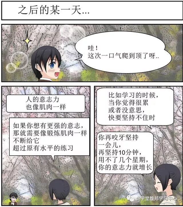 这样孩子以后每次学习的时候,都会形象地想起意志力像肌肉一样能增长的样子,而增长的办法就是“坚持不住的时候,咬牙再坚持一下”。有了这样的形象的认知,和切身的体验,孩子在坚持的时候,主动的控制感就会特别强,就能逐渐坚持得住。