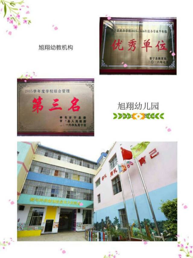 旭翔幼教机构以“一流的管理、一流的服务、一流的师资,为幼儿提供一流的保教质量”为目标,以高素质、高水平的管理团队和稳定、高素质的教师队伍来促进办园水平和办园质量不断提高,形成鲜明的做人活动教育、英语教育、品格养成教育、学习能力培养教育等特色。