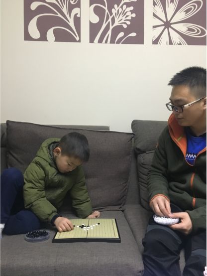 “在学中玩,在玩中学。”玩是孩子的天性,不能一味强迫他们学习,要把学习和生活结合起来,把学习和游戏结合起来,把枯燥的学习变得有趣起来。平时我们经常和张杭航猜字谜、玩数字分分合合、五子棋、讲故事比赛等。我先编一些简单的字谜让他猜,看他感兴趣,再教他尝试着编字谜,这样就有意思,又能复习汉字的写法,比如他自己编的“拉弓射长城(张)”、“满口玉米(国)”等,让我们看到了孩子的想象力和学习能力;数字分分合合,比如先定一个数字10,然后我说“我出2”,他就要迅速地说“我出8”,孩子很喜欢这样的亲自互动,回答正确给他点赞,这样愉快地就记住了数字的加减分成,在班上老师让他领读加减法,让他更加有了成就感!我们也会比赛组词、造句或者背儿歌,不能快速接上的人就罚做下蹲或俯卧撑,这个阶段的孩子特别好胜,比赛可以点燃他们的兴趣和斗志,当然,我们这时候都假装很笨,多多夸奖他,让他获得胜利的喜悦感,增加兴趣和信心。