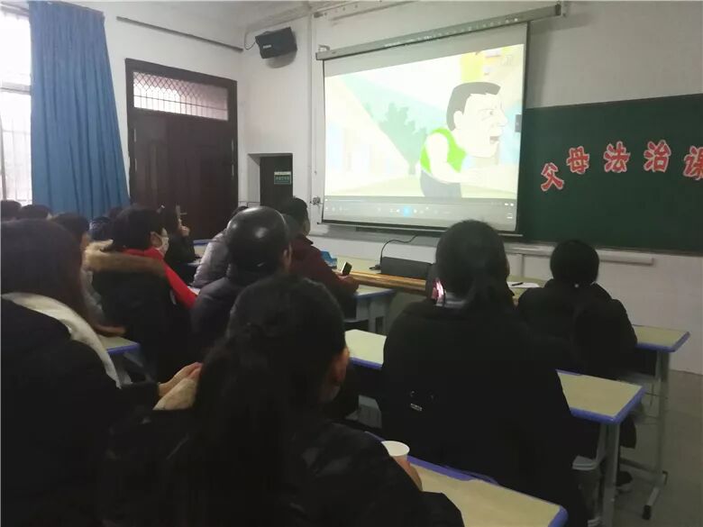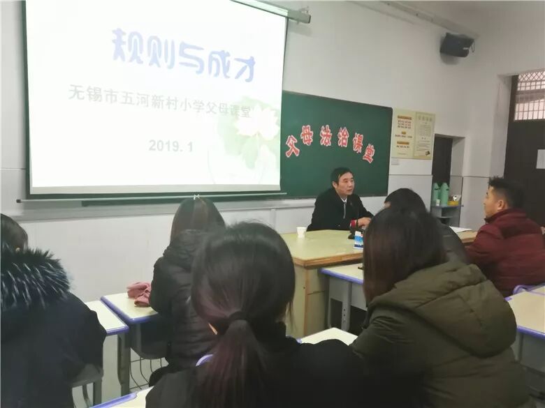1月10日下午,五河新村小学开展了2019年首期“父母课堂”活动。本期“父母课堂”的主题为“为了孩子,父母应增强法治意识”。70多位自主报名的中高年级学生家长参加了本次活动。