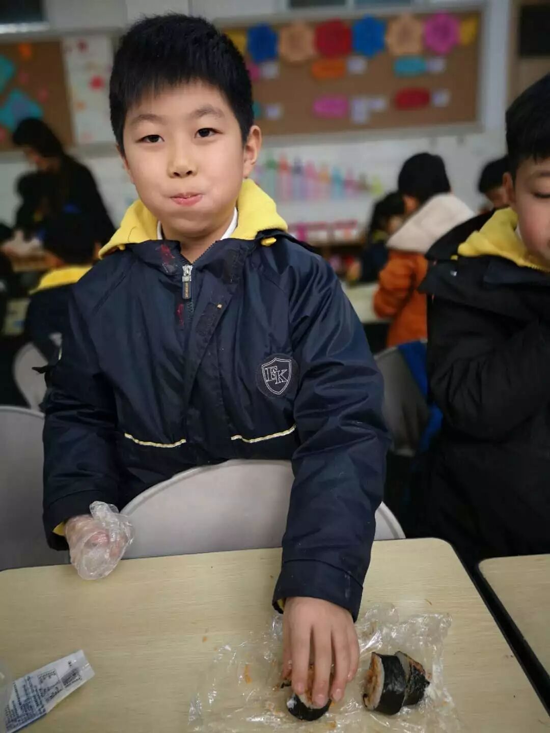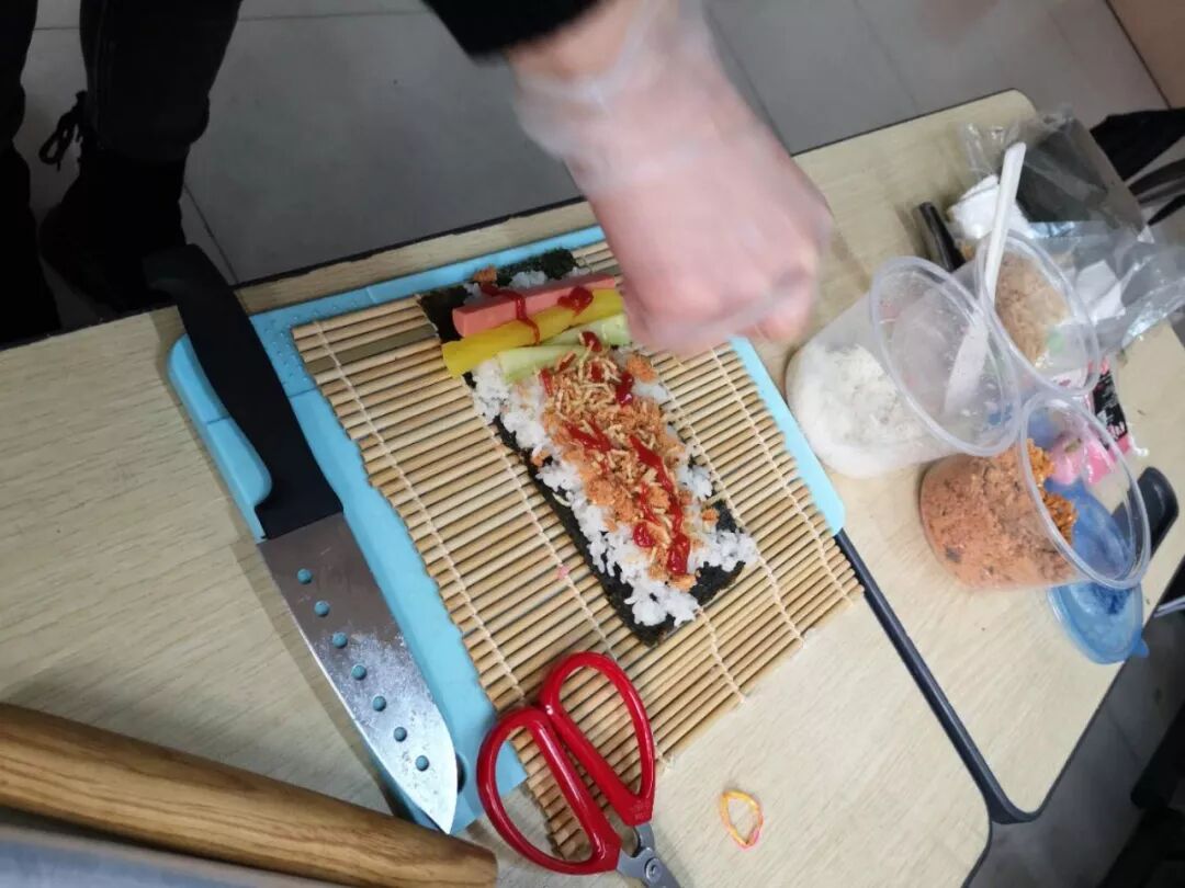 有的孩子米铺得太厚,卷的时候不好卷,有的孩子火腿条放的太多,刚卷一下就撒出来完了,有的孩子不会卷,卷的太松,刚切一刀就散了。我们三位老师也在旁边指导着,尤其是怎么卷,怎么用劲才能卷好。孩子们慢慢地尝试,卷好后切成一段段的摆在自己的保鲜膜上,形状不管是否美观,只要是自己亲手做的,总是香的。孩子们大口大口地吃着,吃完还不忘给爸爸妈妈带回去,看一个个用保鲜膜,保鲜盒装起来,打包的是不是还挺有模有样的。