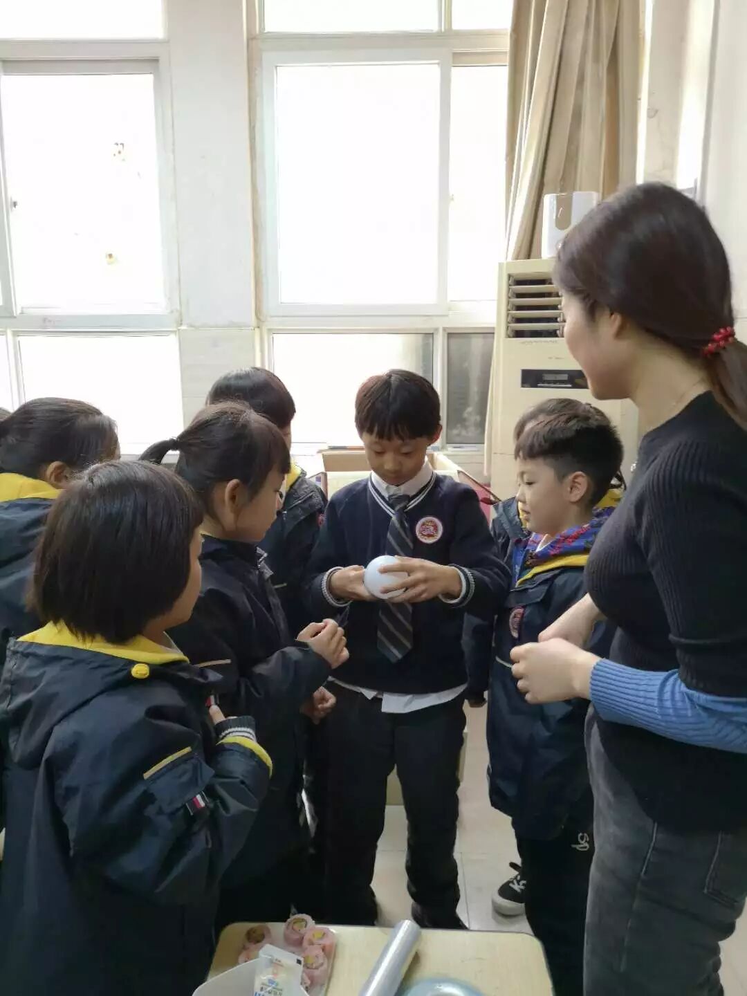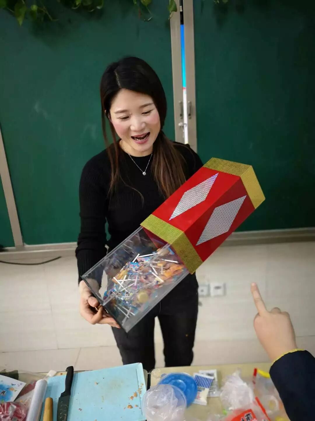 后来揭秘的时候才发现原来机关是手上的戒指,当戒指挨着灯泡下面的时候,产生了磁力,打开了开关,灯就亮了。第二个魔术在快下课的时候表演的,一个长方体的可推拉的盒子,拉开以后是空的,孩子们也都去检查了,没有发现机关,但当大家一起喊“巴拉巴拉变”的时候,再次拉开抽屉,里面就装满了棒棒糖了,孩子们每人分得一个棒棒糖以后还一直追问着阿姨,机关在哪里,什么时候揭秘啊。一个小小的魔术激发起了孩子们的好奇心和求知欲。