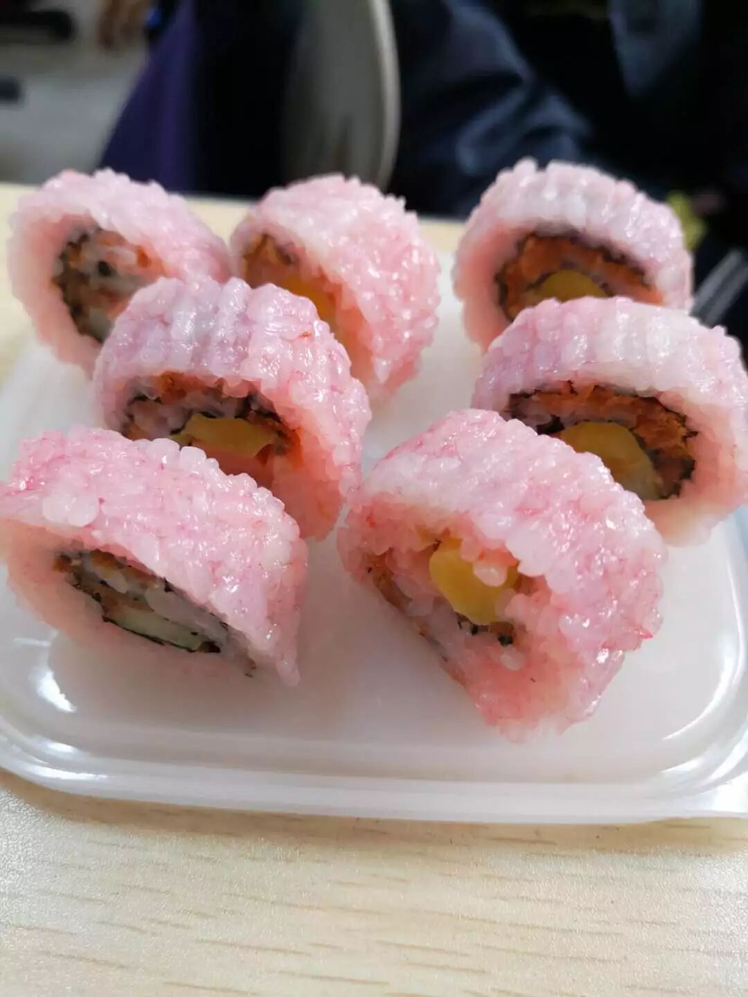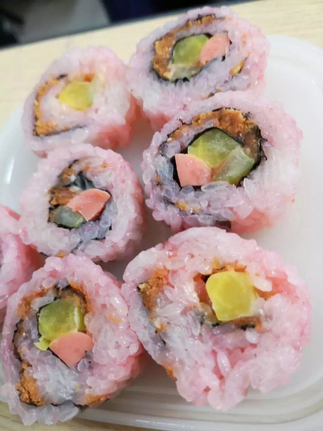 准备材料摆齐放在桌子上,垶宸妈妈开始在前面做示范,教给孩子们两种寿司一种饭团的做法。一种是普通的寿司,一种是米在外面,海苔在里面的寿司。饭团的做法最简单,就是按照寿司的流程,不放海苔片。流程看着简单:把米拌上樱花粉上色,铺一层米,铺一张海苔片,摆上各种条,撒上肉松和沙拉,一卷一切,就可以放盘了。但孩子们自己动手操作起来并没有想象中那么容易。