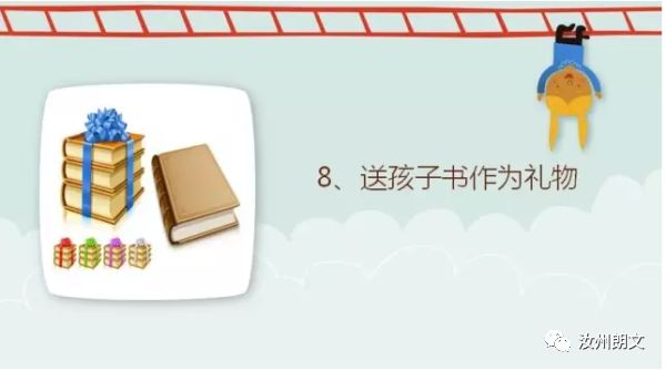 8. 遇到儿童节、元旦或者孩子生日,我们可以买些书送给孩子做礼物。有时孩子有些好的行为,我们想奖励一下,也可以让他挑选书,买了送给孩子。