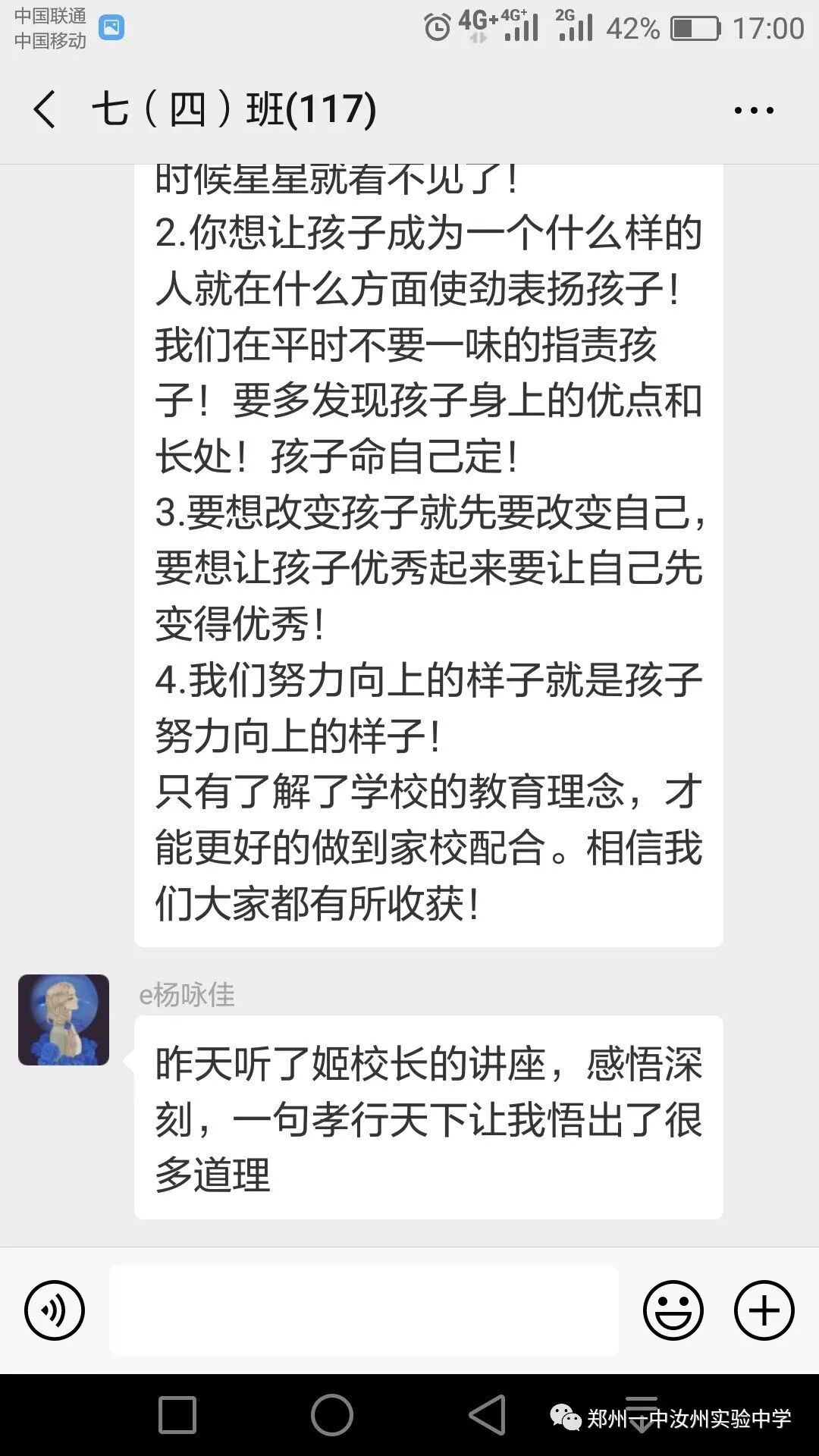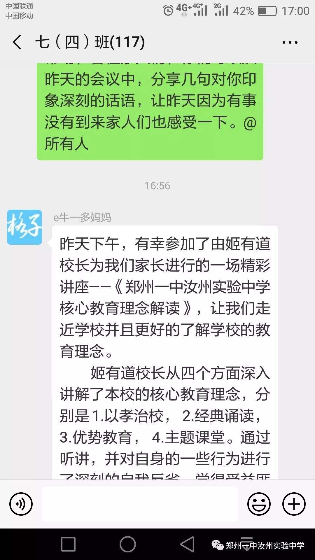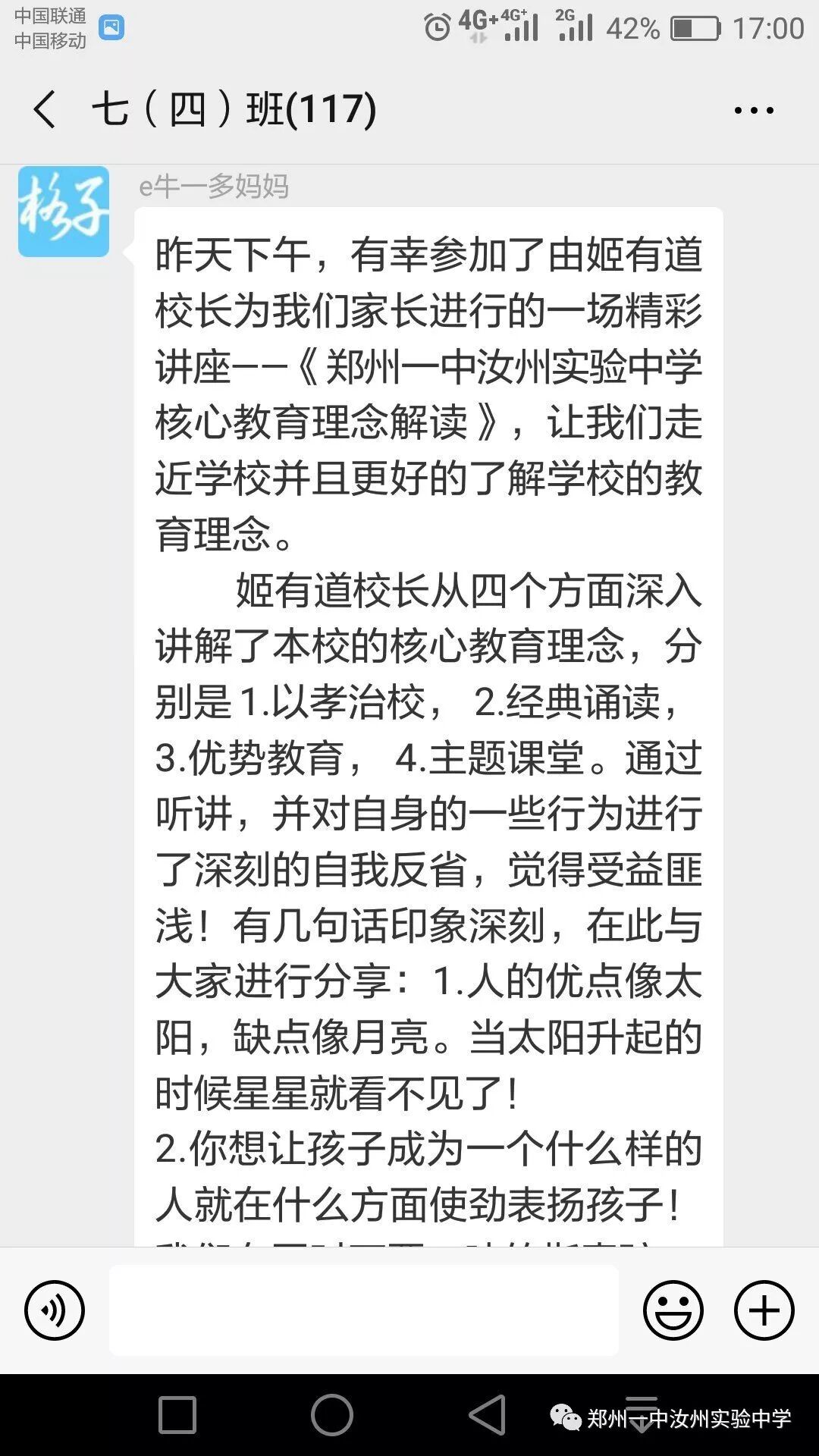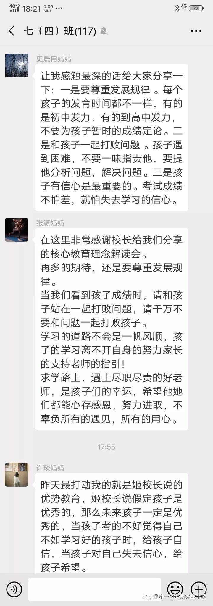 家长会上,姬校长从逐年攀升的中招成绩、市领导的支持、校训、教育格言、教育情怀、我校幸福观等角度全方位、多层次介绍了学校成长历程;同时使家长对我校以孝治校、经典诵读、优势教育、主体课堂四大核心教育理念有了更加深刻的认识;姬校长还从我校专设“道歉日”讲到每周“以你为榜样”获赞优秀教师,让家长们对我校师生的思想道德建设有了一个更进一步的了解。第二课堂的开展,让家长们对我校学生多姿多彩的课外活动有了一个全面的认识。