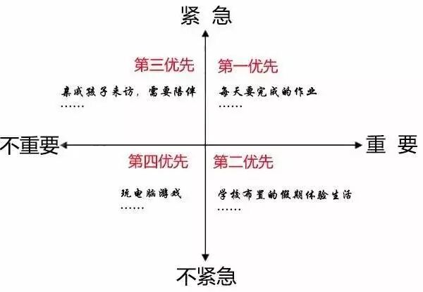 每天的时间都是固定的24小时,如果所有的事情都要做,显然是不够的。因此,家长要教会孩子划分事情的优先级。