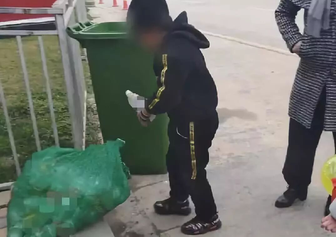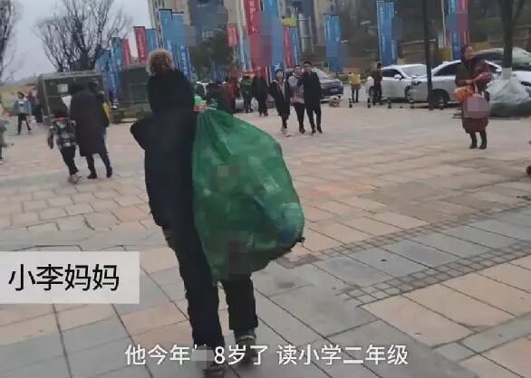 男孩看上去七八岁,穿戴整齐地在贵阳街头的垃圾桶里费力地扒拉着,把塑料瓶装进自己的编织袋里。
