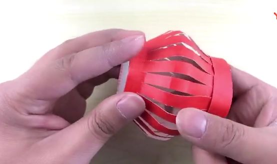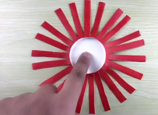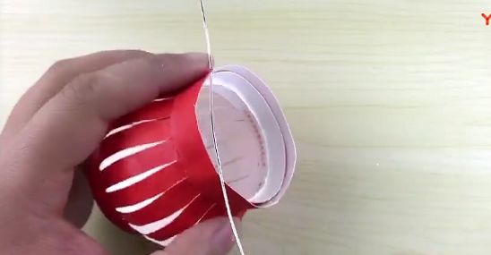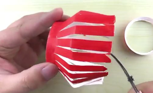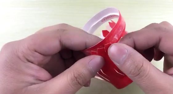 1.准备两个纸杯,涂成喜庆红,用剪刀从杯口开始剪,剪成一条一条的,把纸条展开,如下图