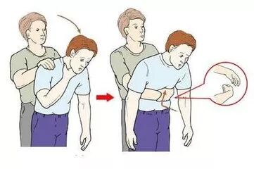 (1)意识清醒的患者可采用立位或坐位,抢救者站在其背后,双臂环抱其。一手握拳,使拇指掌指关节突出点顶在患者腹部正中脐上腹部。另一手的手掌压在拳头上,连续迅速向内、向上推压冲击6到10次,直至异物被排除。