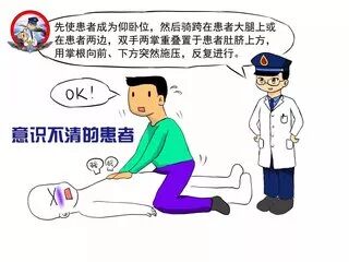 (2)对于意识不清的患者,急救者可以先使患者成为仰卧位,然后骑跨在患者大腿上或在患者两边,双手两掌重叠置于患者肚脐上方,用掌根向前、下方突然施压,反复进行。造成人为的咳嗽将堵塞的食物冲出呼吸道。