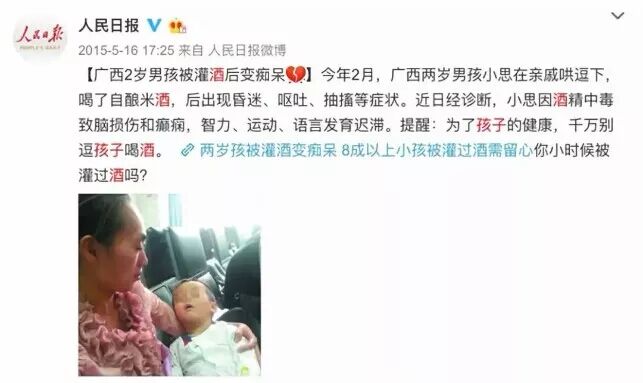 除此之外,全国各地因孩子喝酒而酒精中毒的事件屡见不鲜。