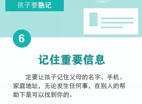 带孩子外出时,家长需随时注意孩子是否在自己身旁或视线范围内。家长平时也要常给孩子重复家人电话号码及报警电话110。一旦有紧急情况或遇到危险,孩子就会有意识赶紧拨通号码找到爸妈和警察。