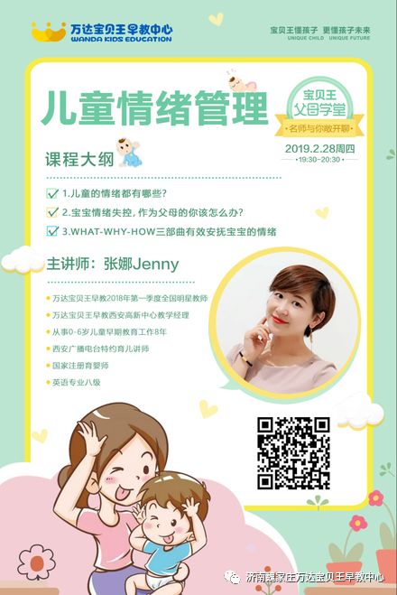 2月28日,万达宝贝王早教明星教师,亲子教育专家张娜老师,为大家带来儿童情绪管理微课堂在线讲座,帮助各位宝爸宝妈们解答儿童心理健康教育中的诸多问题! 可千万不要错过啦~