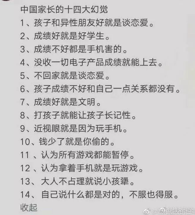 前几天,微博上出现了#中国家长的十四大幻觉#话题,里面所总结的“幻觉”直指当今时代家庭教育的弊端。例如“成绩不好都是手机害的”、“没收一切电子产品成绩就能上去”、“孩子成绩不好和自己一点关系都没有”、“打孩子就能让孩子长记性”、“自己说什么都是对的,孩子必须得服”等等。