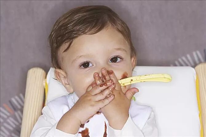 这时的孩子,虽然体格上还是一个小不点,但浑身上下却有无穷的力量来“折腾”亲妈:用手抓饭、扔东西、抢东西……真有几分“野蛮人”的样子!