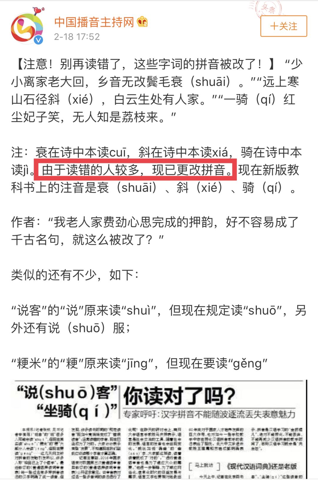 最近几天,@中国播音主持网和@中央人民广播电台先后发博,声称“这些字词的拼音被改了。”