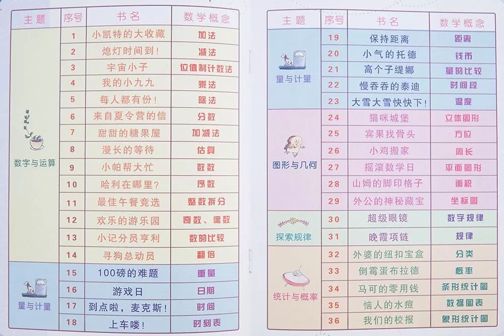 · 内容与目录:本书分为36册,分为“数字与运算”、“量与计量”、“图形与几何”、“探索规律”和“统计与概率”共五部分内容,几乎涵盖了小学阶段所有重要的数学知识。每本书由一个故事引申出一个数学主题。
