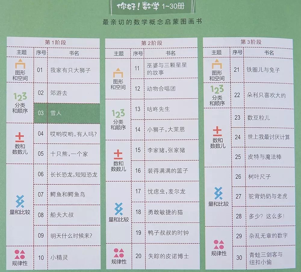 阶段以及板块的区分比较明确,所以层次会分明一些,针对性会相对比较强,故事内容文字量较小,以图画为主,画风清新,适合小宝宝亲子阅读,故事内容设计较为简单,进行数学启蒙还不错。但也并不分阶段销售,只能买全套。所以有可能会买了全套,当时看了现阶段的几本后,就搁置忘记了。