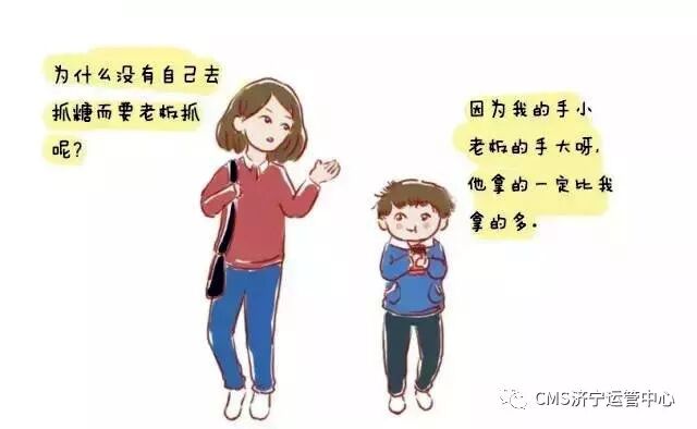 有一个聪明的男孩,有一天妈妈带着他到杂货店去买东西,老板看到这个可爱的小孩,就打开一罐糖果,要小男孩自己拿一把糖果,但是这个男孩却没有任何的动作。几次邀请之后,老板亲自抓了一大把糖果放进他的口袋中。