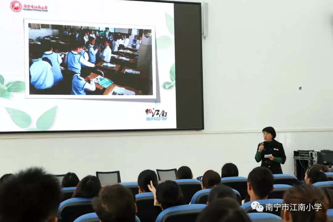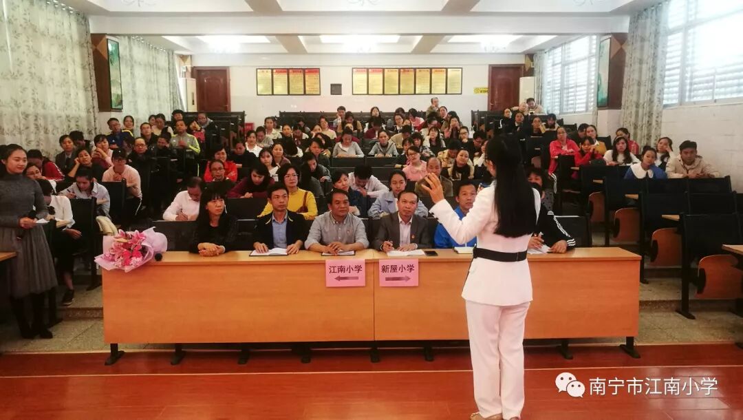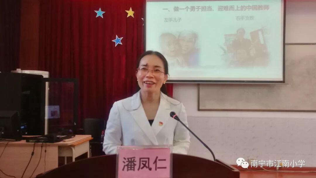 江南小学江南校区里, 140多名教师倾听了南宁市中小学师德巡讲团成员潘凤仁老师讲述她在泰国支教的经历。远离祖国和家庭的潘老师,在异国他乡传播着优秀的中华文化。她用行动证明了“爱的教育没有国界,爱岗敬业同样没有国界”,为当地的人民生动展示了一个“移动的中国”。