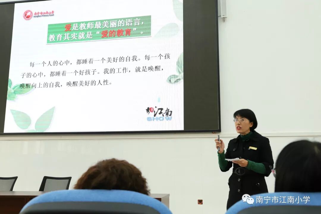 江南小学华府校区和珺熙校区的70多名教师,聚集在华府校区崭新的多媒体教室,聆听江南区师德巡讲团成员黄莉萍老师的师德巡讲报告。