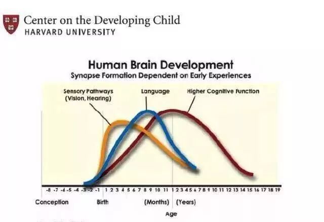 首先,我们先来看看数据:一个是哈佛大学儿童发展中心所发布的“人类大脑发展”曲线图,其中Higher Cognitive Function(更高认知能力,其中包括概念形成,解决问题,抽象思维,冲动控制,逻辑思维和创造力等能力)的发展顶峰早得令人发指,居然是在10个月到4-5岁之间。