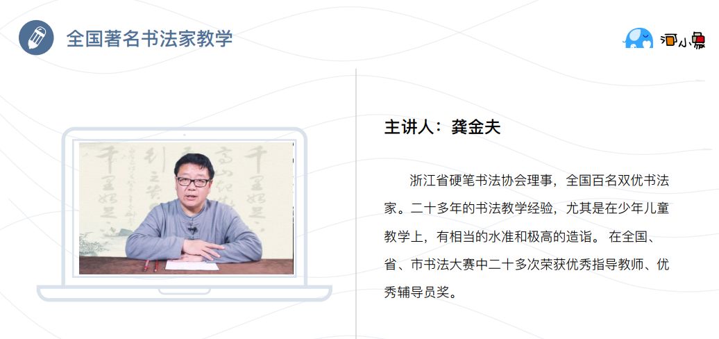 4年前,龚金夫老师在这套学习方法搬到线上书法课“河小象书法课”,使得更多的孩子有机会也能一起学习。