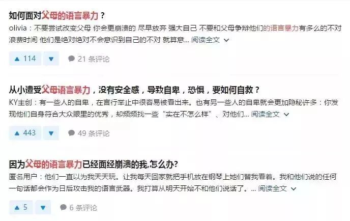 在知乎上搜索关键词“父母的语言暴力”,发现很多在父母”吼式“教育环境中成长的自述者,要么心怀恐惧,不知父母下一步会做出哪些疯狂举动;要么畏首畏尾,做什么事都提不起兴趣。