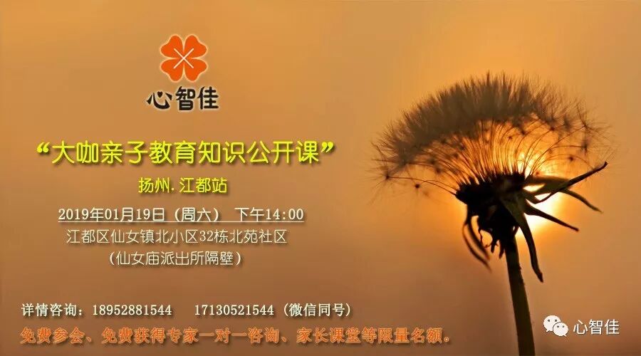 心智佳“大咖亲子教育知识公开课”为多地巡讲模式(扬州、镇江、常州、无锡等地),会针对“亲子教育”中的常见具体问题(如网瘾处理、亲子沟通、厌学处理、青春期问题处理等)定期开讲,您可持续关注“心智佳“微信公众号获得及时信息。