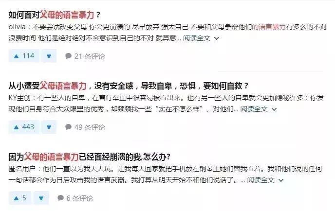 在知乎上搜索关键词“父母的语言暴力”,发现很多在父母”吼式“教育环境中成长的自述者,要么心怀恐惧,不知父母下一步会做出哪些疯狂举动;要么畏首畏尾,做什么事都提不起兴趣。
