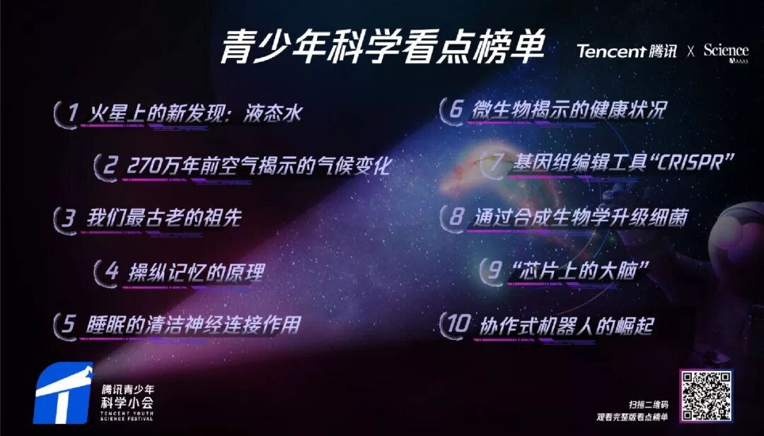 小会上,腾讯与《Science》合作,推出了全球首个“青少年科学看点榜单”。该榜单综合了权威性与关注度,由《Science》杂志权威科学编辑联合顶尖科学家,从近十年来重大突破中的前沿科学问题中遴选初筛,入围二十个科学问题,并结合腾讯内容平台QQ看点上的10万名中国青少年调研的兴趣匹配,最终出炉十大科学看点。
