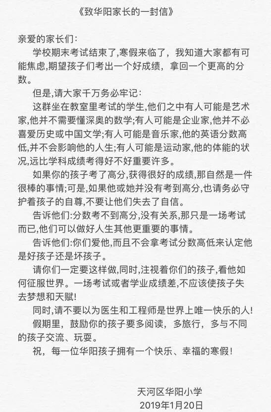 据悉,这封信来自广州市天河区华阳小学,针对期末考结束,信在开头即开门见山指出家长可能存在焦虑心理,可能非常期待孩子考出一个好成绩,拿出一个更高的分数,而画风一转,写道这群坐在教室里考试的学生,他们的未来有很多的可能性: