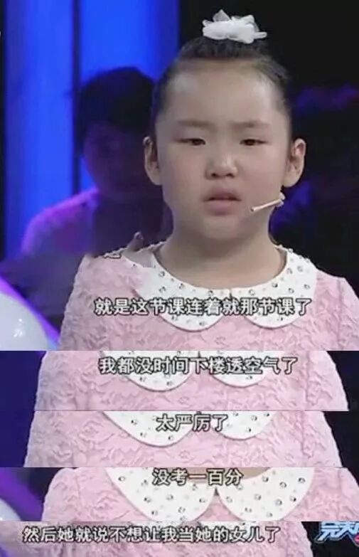 但整个过程她眉头紧锁,脸上写满了与年龄不符的忧愁。她的告白内容是:“希望妈妈不要太严厉,不要把她的课排得那么密,不要总生气,不要总拿她和别人家的孩子比。”她平时除了上学还要上各种课外班,包括朗诵、奥数、书法、唱歌、跳舞、钢琴等,一节课连着一节课,连下楼透气的时间都没有。