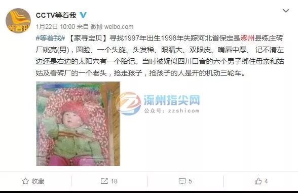 【家寻宝贝】寻找1997年出生1998年失踪河北省保定市涿州练庄砖厂姚亮(男),圆脸、一个头旋、头发稀、眼睛大、双眼皮、嘴唇中厚、 记不清左边还是右边的太阳穴有一个胎记。当时被疑似四川口音的六个男子绑住母亲和姑姑及看砖厂的一个老头,抢走孩子,抢孩子的人是开的机动三轮车。