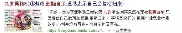 2018年8月28日,鲁西北一9岁男孩因沉迷王者荣耀游戏,竟在深夜割腕自杀,并在遗书中强调:我会满血复活,重新归来。