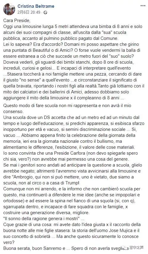 一位家长给学校校长写了一封抗议信,内容如下:‘你知道吗?亲爱的校长 ,您是否看到了Facebook上发布的一条内容? 今天,一辆5米长的豪华轿车停在公立学校的门口等着接一个8岁的女孩。而在这辆豪车旁边则停放着一辆由市政府出资提供的小型校车。今晚,我们家长应该站在一起,摈弃这种刻意炫富的行为,让我们的孩子回到现实。