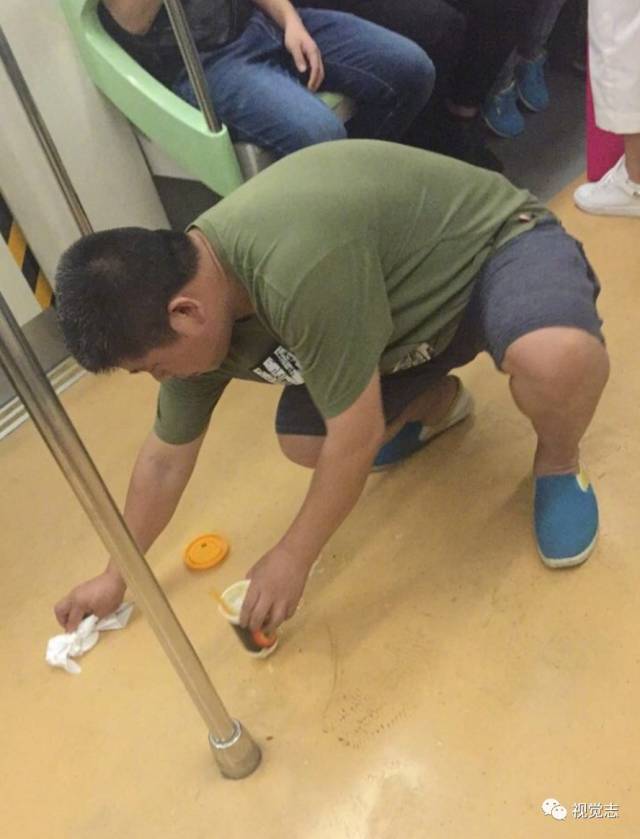 北京地铁上,一个孩子因为身子不适吐了,孩子爸爸赶忙鞠躬给大家道歉,然后蹲在地上拿纸擦,擦了好久。