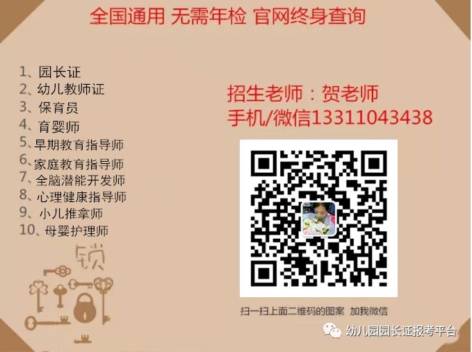 报考园长证、幼儿教师证、保育师、育婴师、家庭教育指导师、早期教育指导师、营养师等幼教证书。积极响应国家政策,具备丰富的学习课程,保证学员学习质量,设有网教班学习考试更方便。证书官网查询,全国通用,终身有效。