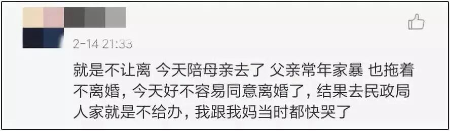 前几天的情人节有网友发帖称,自己的父亲常年家暴母亲,好不容易说服他离婚,却被当地民政局告知情人节不办离婚: