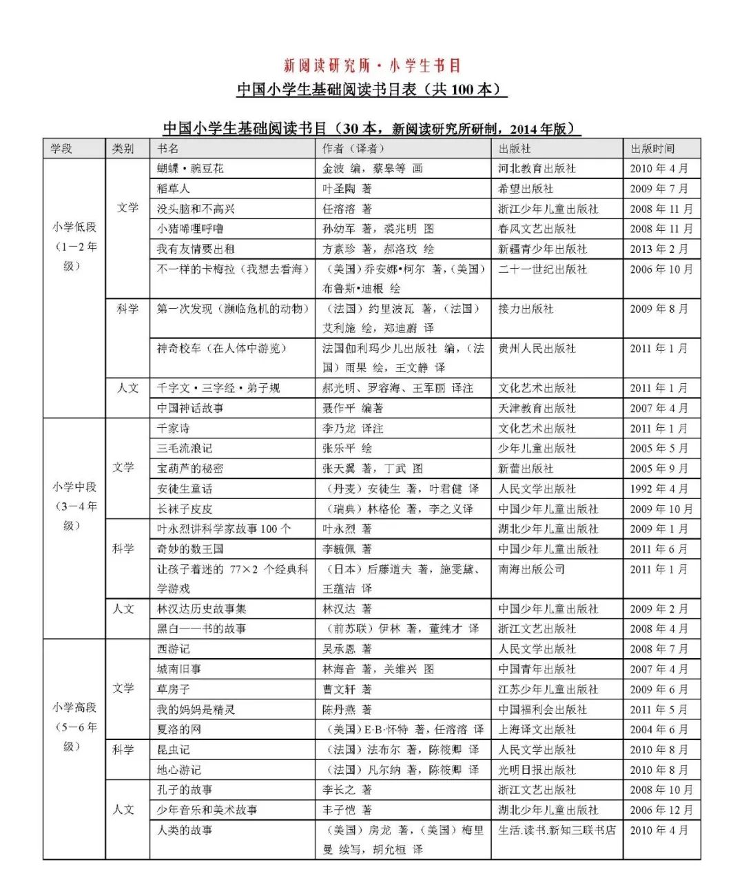 中国小学生基础阅读书目推荐: