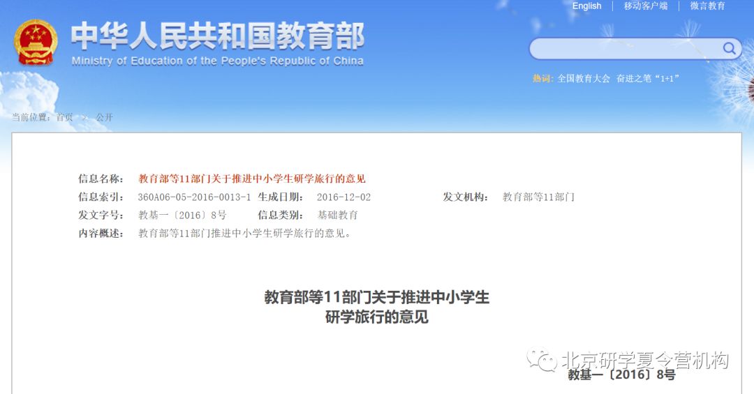 2016年12月19日,教育部等11部门印发了《关于推进中小学生研学旅行的意见》,要求各地将研学旅行摆在更加重要的位置,推动研学旅行健康快速发展。