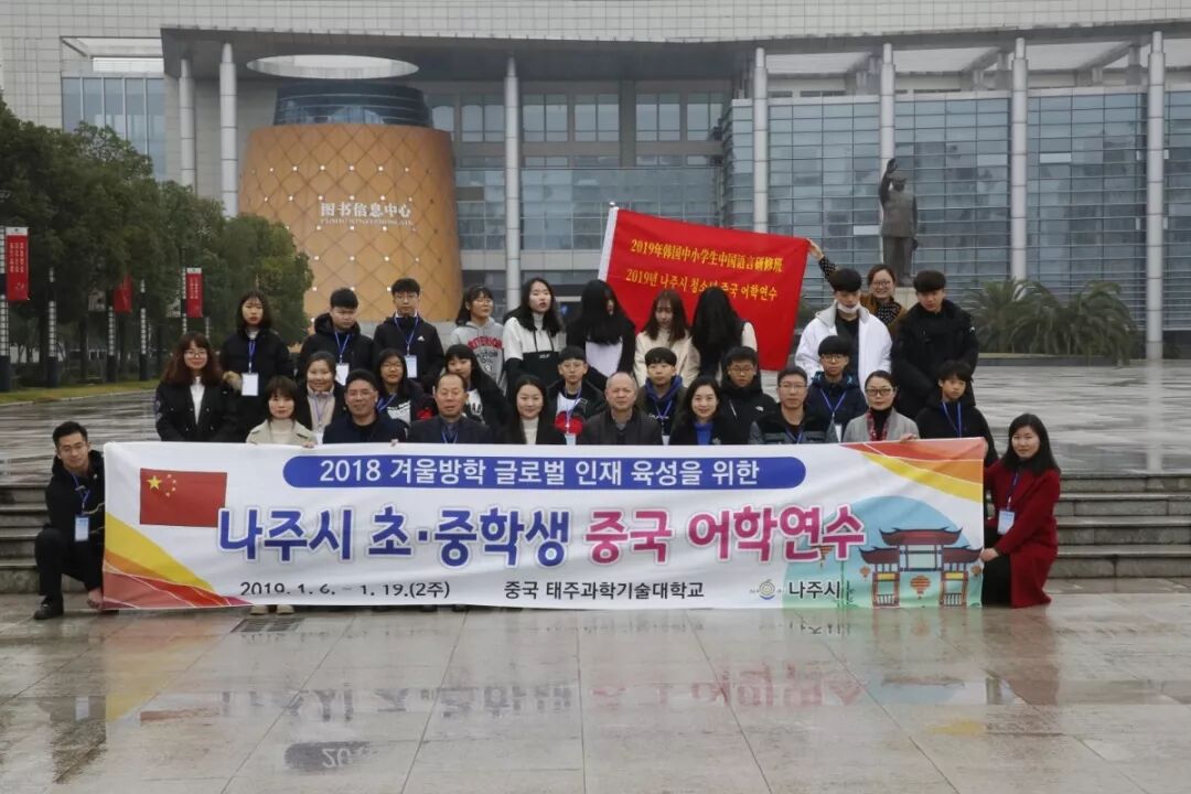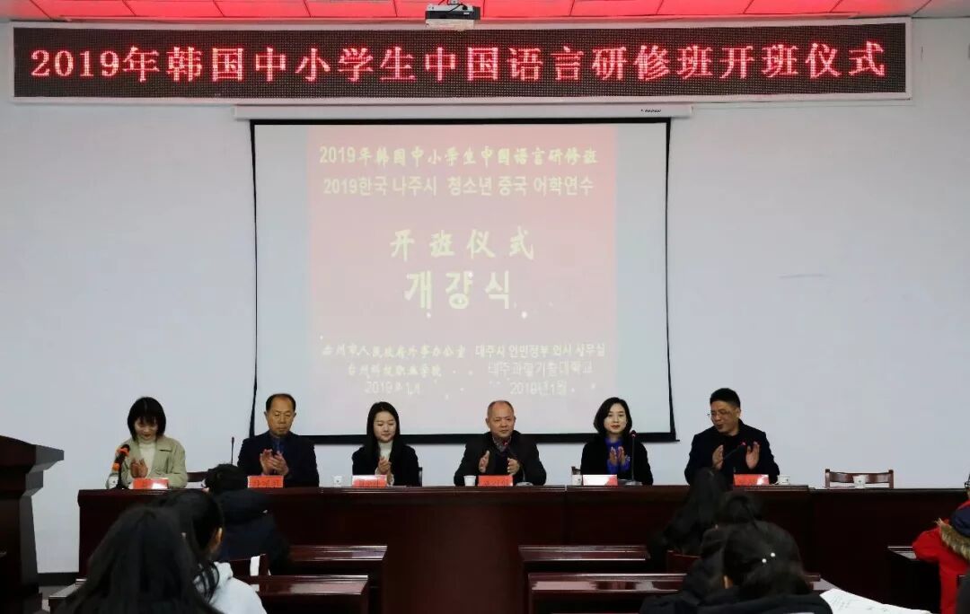 1月7日上午9点,2019年韩国中小学生中国语言研修班在台州科技职业学院隆重开班。参加今天开班典礼的领导有:台州科技职业学院党委委员、副校长包锦阳、台州市对外友好协会专职副会长王蓓、韩国罗州市政府官员沈召罗、车溪玔等,会议由人文旅游学院院长毛时亮主持。