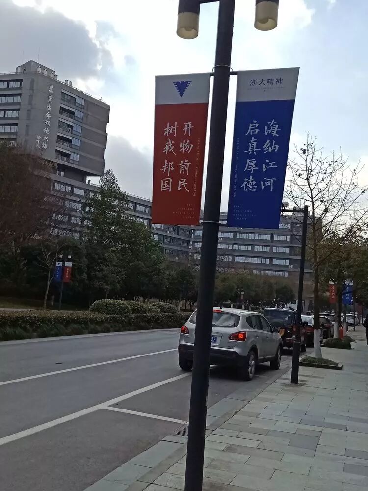 校园里马路两侧的路灯上都挂着浙江大学的校训和他们的核心价值观
