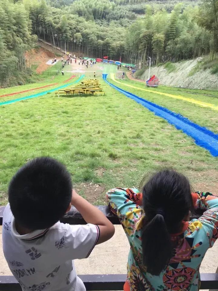 挺立在蓝天下的坡顶,远望无尽群山,助滑竿一点,身体前倾,转眼间已翻飞在绿野从中,没有茫茫白雪,没有身后两道滑痕,只有那满目的绿野碧浪和一望无际的蓝天白云,属于莫干山特有的清风掠过你的整个身心,何等凉爽,何等快意。