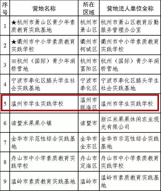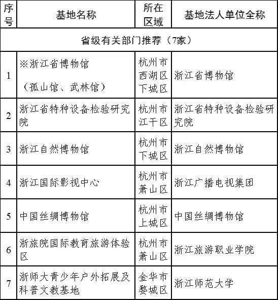 浙江省中小学生研学实践教育基地营地(第一批)名单,是在省级有关部门直接推荐、各设区市教育部门与文化和旅游部门共同推荐的基础上,经组织对基地营地的课程审核、营地的实地踏勘、专家评审和综合评定后认定的。