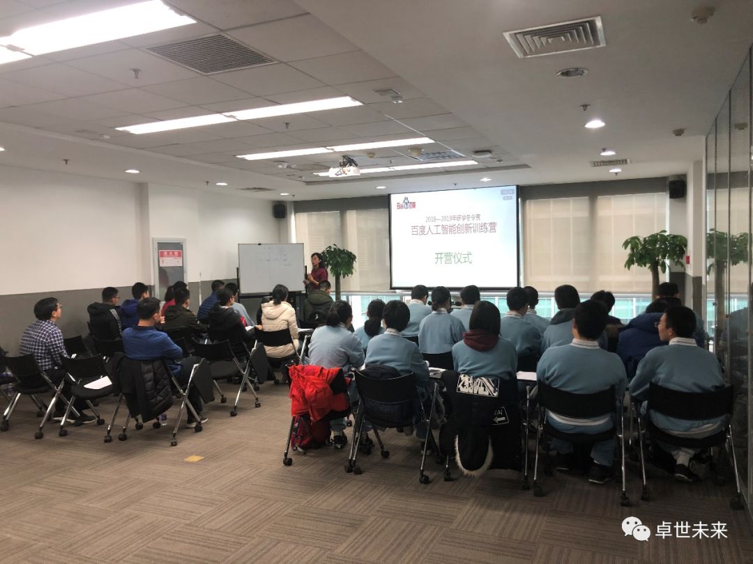 百度人工智能创新训练营开营仪式:百度资深产品经理与八中的同学介绍百度人工智能产品体系,具体讲解AI+教育的人工智能发展,互联网的本质和人工智能在教育行业形成的智能交互产品,引用百度无人车、金融、百度教育和百度AI 5大技术(文字识别、语音识别、图像识别、人脸识别、语音合成)为学生介绍人工智能产品